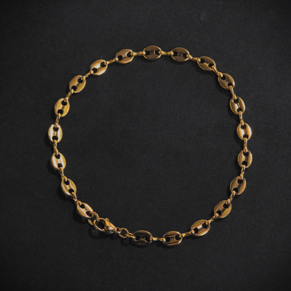 A bracelet commonly known as a coffee bean bracelet. Made of stainless steel and plated with 18k gold for its gold version. A bracelet that will make a statement in any of your outfits.