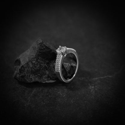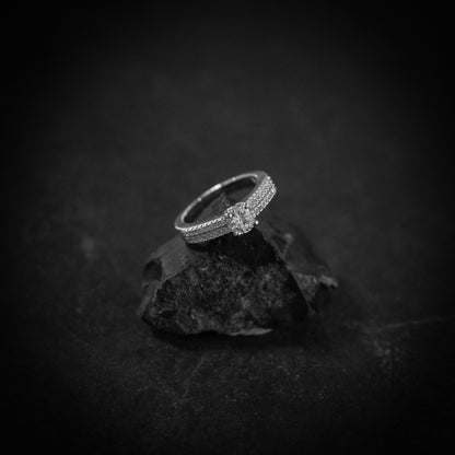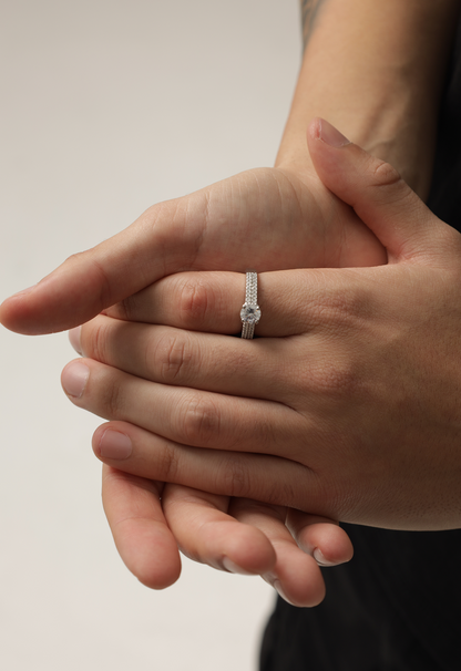 Este anillo, hecho de plata de ley.925 y chapado en oro de 18k, combina un diseño clásico con todo el poder y brillo de las circonitas, ya que esta recubierto de estos pequeños brillantes por la alianza pero coronando la pieza se encuentra un brillante de gran tamaño que le da ese toque de distinción y brillo que nos caracteriza.