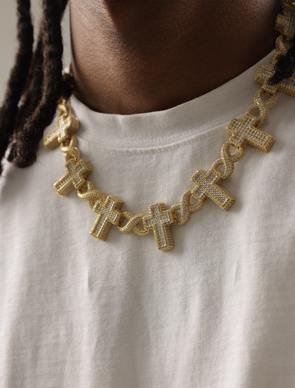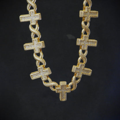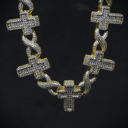 Esta cadena es una pieza de joyería única e impresionante. Chapada en oro de 18k y recubierta de circonitas de un brillo máximo, esta cadena de auténtico lujo tiene un diseño de cruces unidas por un enlace en forma de infinito, dándole a esta cadena una personalidad inigualable. Esta pieza le dará un brillo y color único a tu estilo, haciendo que destaques por encima del resto.