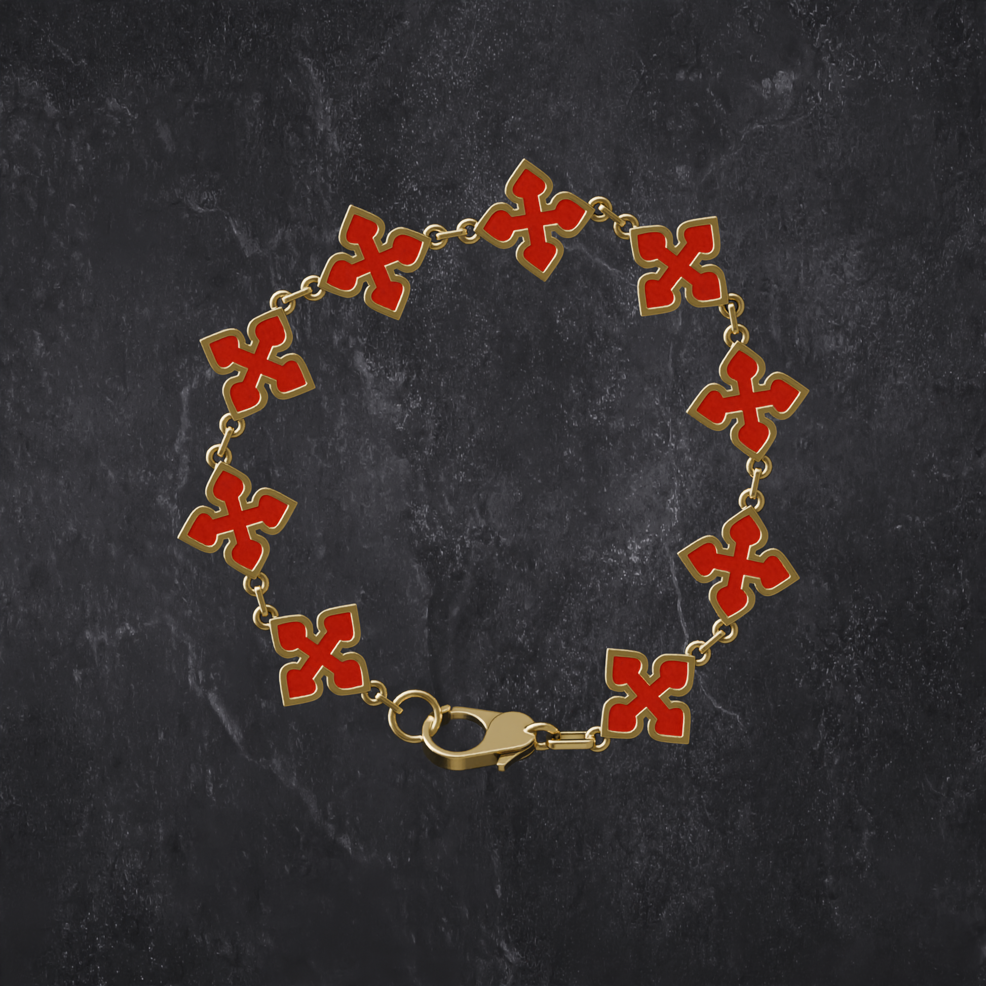 Un brazalete con nuestros eslabones de flor, hecho en acero inoxidable chapado en oro de 18k para darle su máximo brillo y calidad. Y además esmaltamos a mano cada eslabón para darle su color característico e inconfundible. Una pieza única en el mundo.