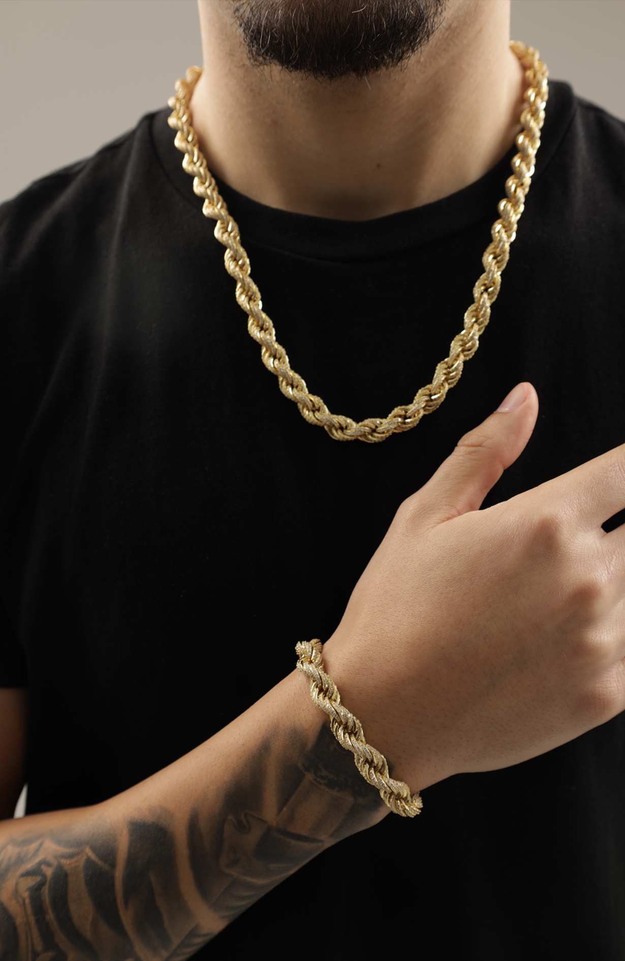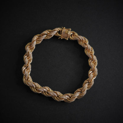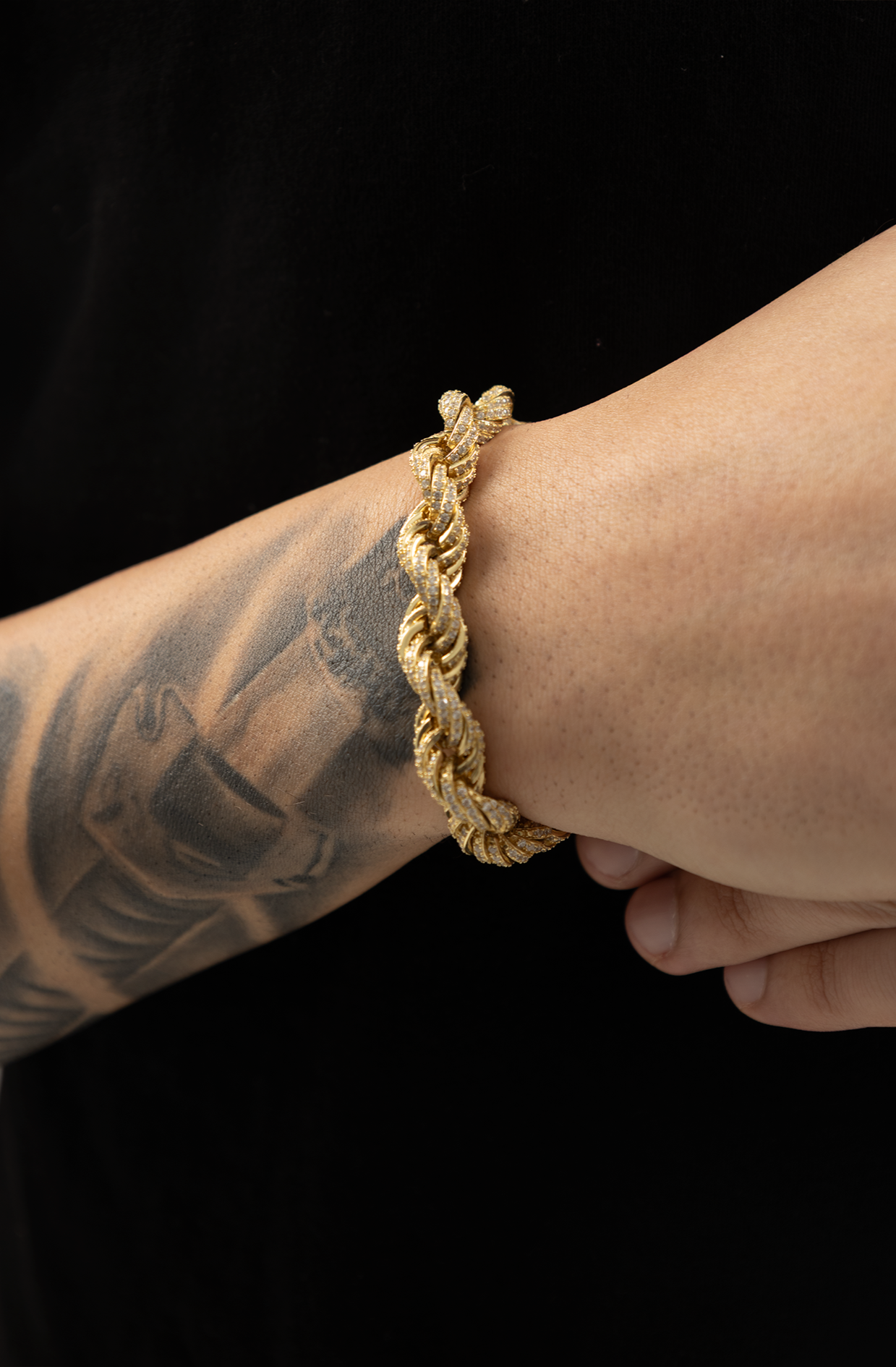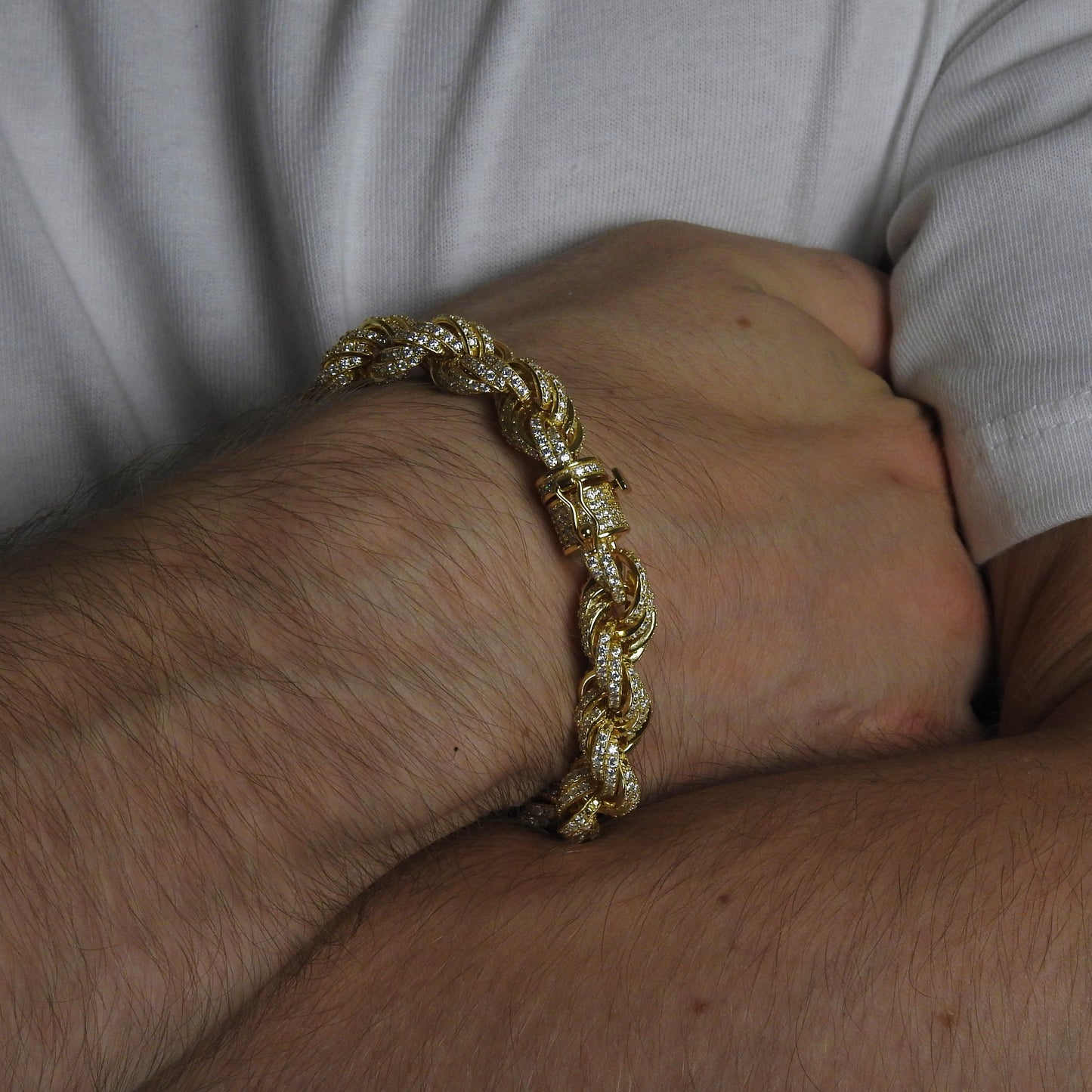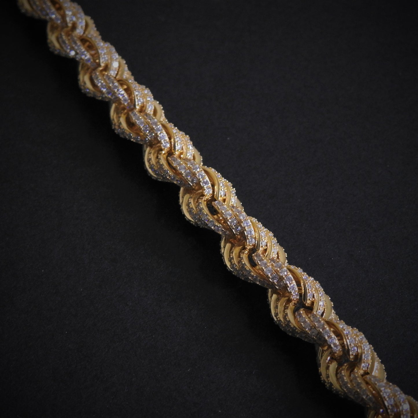 Este lujoso brazalete junta dos de nuestras cosas favoritas: las cadenas rope y los brillantes. La hemos creado intentando mantener la sencillez de la pulsera rope pero transformándola a una pulsera recubierta de brillo y lujo. Está hecha de plata de ley .925 y chapada en oro de 18K, además de tener una gran cantidad de diamantes de imitación que le dan un brillo único.